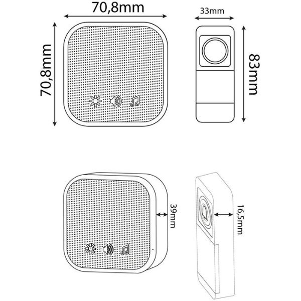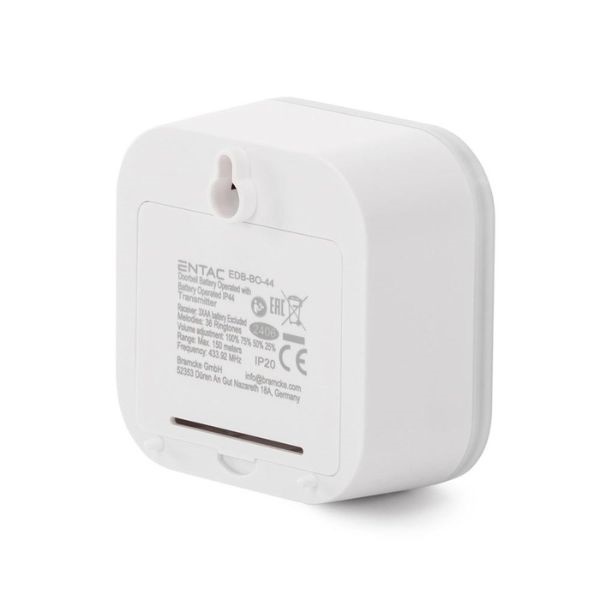 Bezdrátový zvonek německé značky Entac je ideálním řešením bez potřeby řešit rozvody vodičů. A jelikož je jak přijímač, tak tlačítko, na baterie, můžete jej provozovat i v místech bez přístupu k elektrickému proudu. Do přijímače zvonku vložíte 3 tužkové baterie AA, které nejsou součástí balení a je potřeba je přikoupit. Přijímač pak můžete ponechat položený nebo jej zavěsit na háček na zeď, na zadní straně přijímače je k tomu určený otvor. Tlačítko je bezdrátové, jen do něj vložíte přiloženou knoflíkovou baterii CR2032 a buď jej přilepíte přiloženou oboustrannou páskou nebo jej můžete přišroubovat.