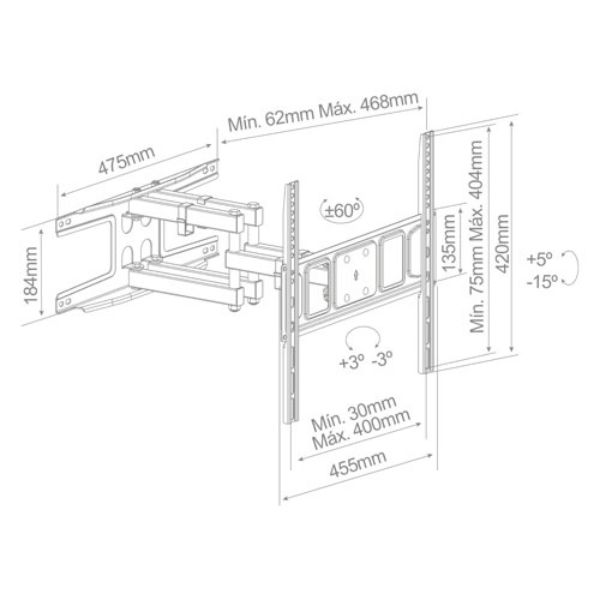 Univerzální a pevný kloubový držák pro větší televizory (32" - 70") od španělské značky Holmios. Ideální řešení, pokud chcete mít možnost vysunout televizi až o 47cm před stěnu a přitom ji moci otáčet až o 60° do stran a naklopit až o 5° nahoru nebo až 15° dolu.