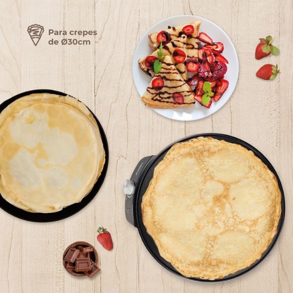 Hliníková pečicí deska s nepřilnavým povrchem zajistí rovnoměrné rozložení tepla a snadné odebrání palačinek. Díky plynulé regulaci teploty otočným knoflíkem si snadno nastavíte optimální intenzitu ohřevu pro různé typy jídel.