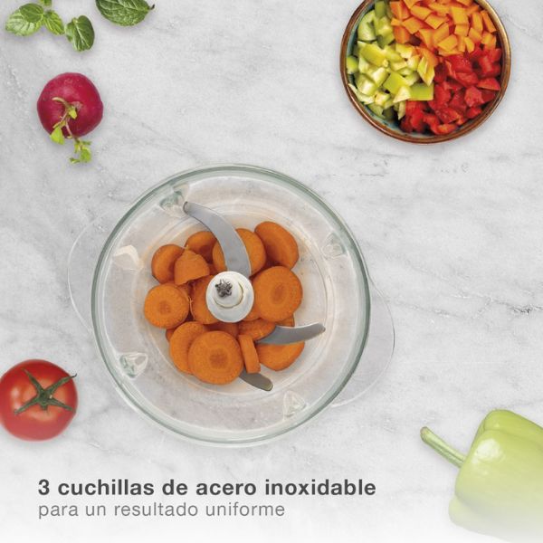 S tímto elektrickým sekáčkem snadno nasekáte zeleninu, zrní, maso i led. Sekání horkých potravin nebo mixování polévek a omáček není žádný problém, mixér je vybaven 1 l nádobou z varného skla. Můžete si zvolit buď poloviční rychlost nebo turborychlost, podle toho, co sekáte. 200g mrkve, česneku, zrní nebo masa nasekáte přibližně za 30 sekund.