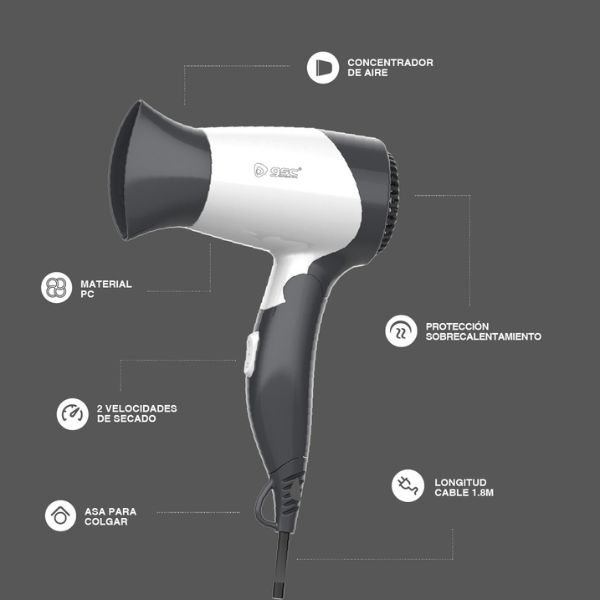 Fén je vybaven ochranou proti přehřátí, která zajišťuje bezpečný provoz i při delším používání. Závěsná rukojeť umožňuje pohodlné uložení v koupelně nebo hotelovém pokoji. Napájecí kabel o délce 1,8 m poskytuje dostatečnou volnost pohybu při používání.