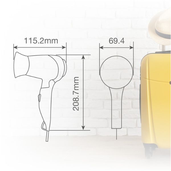 Fén je vybaven skládací rukojetí, která výrazně šetří místo v zavazadle a umožňuje snadnou přepravu. V rozloženém stavu má rozměry 116 × 209 mm, po složení pouhých 110 × 170 mm, takže se bez problémů vejde do kufru i cestovní tašky.