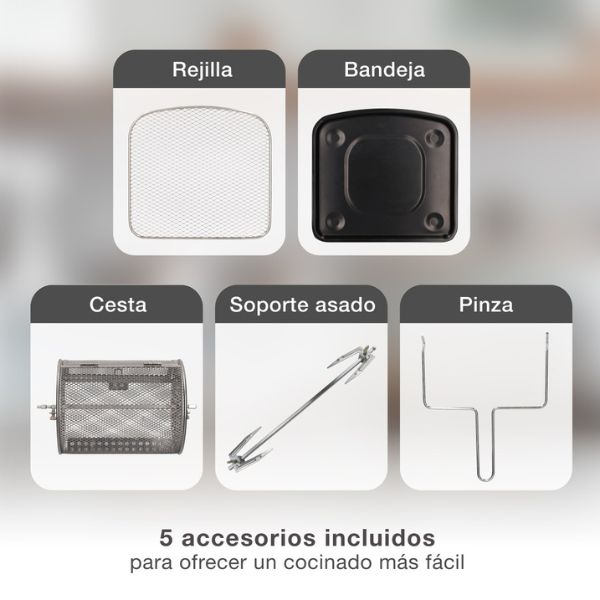 - Objem 10 l – dostatek prostoru i pro menší kuře nebo vícero porcí najednou – grilovací mřížku můžete umístit do 3 poloh pod rožněm a 2 poloh nad rožněm.