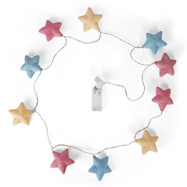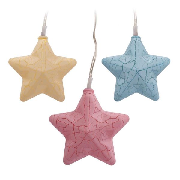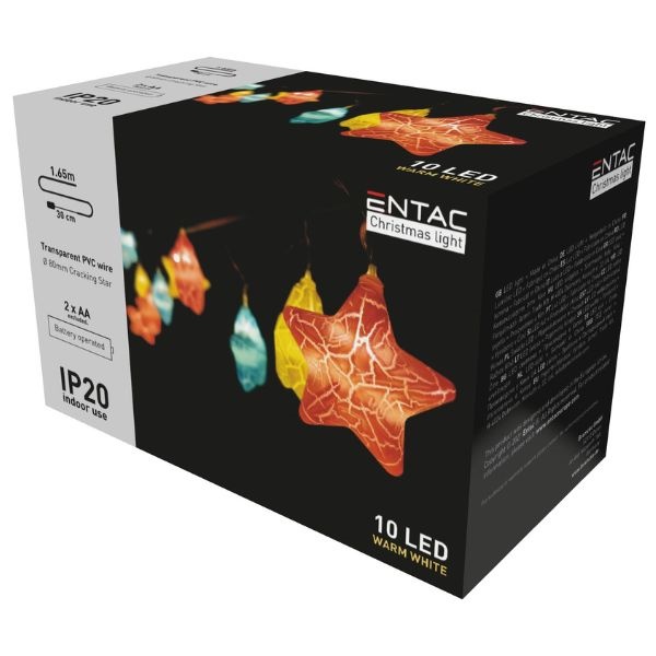 Elegantní vánoční řetěz sestává z 1,35m dlouhého průhledného kabelu s 10 ozdobnými barevnými vánočními hvězdami o velikosti 80mm, v nichž jsou umístěmy LED diody vydávající světlo. Vánoční řetěz je ukončen přívodním kabelem o délce dalších 30cm, na jehož konci najdete průhlednou krabičku na 2 tužkové baterie a spínač, kterým vánoční řetěz rozsvítíte a zhasnete.