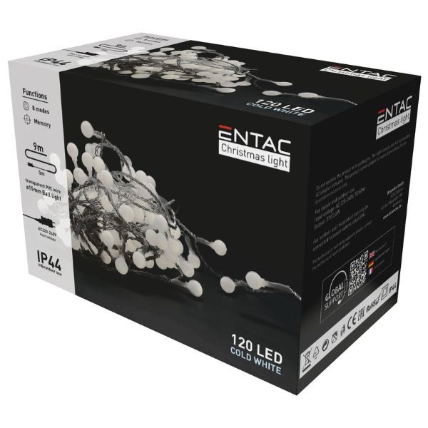 Elegantní vánoční řetěz sestává z 9m dlouhého průhledného kabelu se 120 LED diodami v podobě bílých kuliček o průměru 1,5cm. Vánoční řetěz je ukončen přívodním kabelem o délce dalších 5m, dosáhne tedy bez problémů k nejbližší zásuvce.