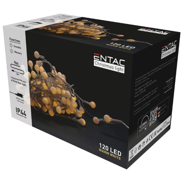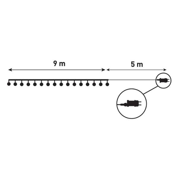 Elegantní vánoční řetěz sestává z 9m dlouhého průhledného kabelu se 120 LED diodami v podobě bílých kuliček o průměru 1,5cm. Vánoční řetěz je ukončen přívodním kabelem o délce dalších 5m, dosáhne tedy bez problémů k nejbližší zásuvce.