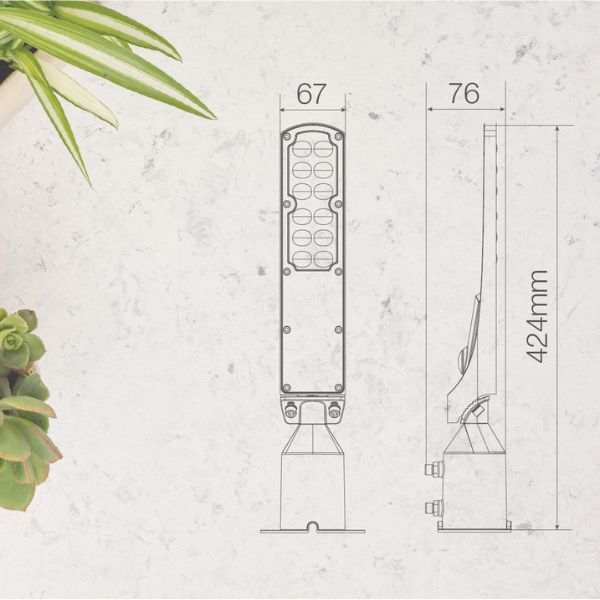Toto LED pouliční osvětlení je na konci vybaveno dutou kruhovou patkou s vnitřním průměrem 62 mm, kterou lze nasunout na stožár o průměru 50–60 mm. Patka má hloubku 90 mm. K upevnění slouží dva velké imbusové šrouby, které jsou součástí balení a pro které jsou v patce připravené závity.