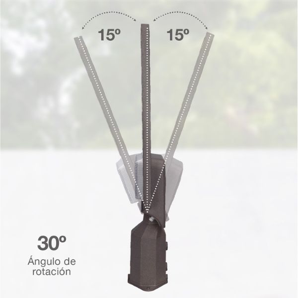 Také při tomto způsobu uchycení platí, že instalace je zamýšlená ve vodorovné poloze. Svítidlo lze následně naklopit o 15° nahoru nebo dolů, ale při svislém osazení stožáru by světlo nesměřovalo správně dolů.