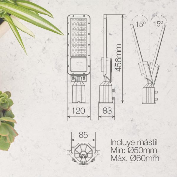 Svítidlo nabízí světelný tok 5700 lm, který zajistí dostatečné osvětlení větších venkovních ploch při zachování rozumné spotřeby energie. Je vhodné i pro instalaci do vyšší výšky, přibližně okolo 6 metrů, kde stále poskytuje kvalitní a prakticky využitelné světlo pro běžný provoz i vyšší bezpečnost pohybu osob a vozidel.