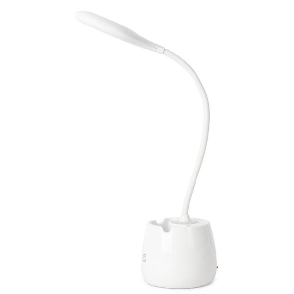 Prémiová nabíjecí LED stolní lampa o výkonu 5W, se světelným tokem 200lm. Svítí studenou barvou světla. Tato stolní lampa má na přední straně dotykové ovládání, kterým ji zapnete, nastavíte si úroveň jasu ve 3 krocích (100%, 60% nebo 30%) a též ji tímto dotykovým spínačem vypnete. Dalším dotykovým spínačem zapnete nebo vypnete noční světlo, které svítí teplou barvou světla u základny nohy lampy. Oba typy světla jsou na sobě nezávislé, mohou svítit buď samostatně nebo naráz. Ohebným ramenem lze lehce nastavit směr svícení.
