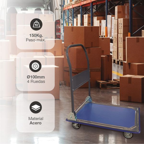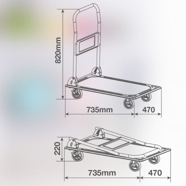 Transportní vozík má nosnost 150 kg, takže je vhodný pro přepravu krabic, balíků, nářadí, spotřebičů nebo jiného materiálu. Základna o rozměru 735 × 470 mm poskytuje dostatek prostoru pro stabilní uložení nákladu.