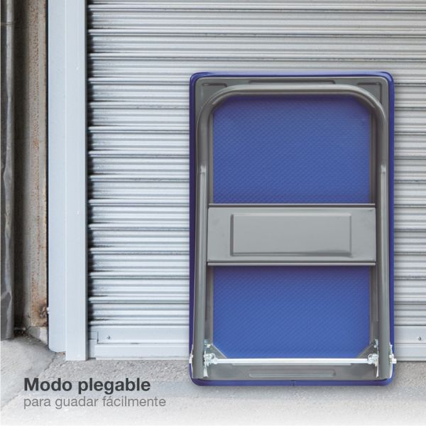 Základna vozíku je vyrobena z oceli, její povrch má modrou barvu, která působí profesionálně a zároveň prakticky. Robustní konstrukce je navržena pro dlouhodobé používání i při časté manipulaci s těžkým nákladem.