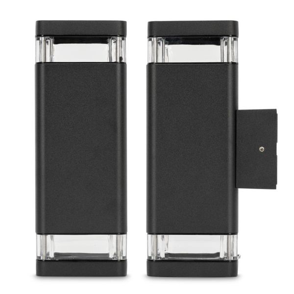 Prémiové venkovní nástěnné svítidlo na 2 led žárovky bodovky s paticí GU10 o příkonu max 10W každá, fungující na napětí 220-240V.