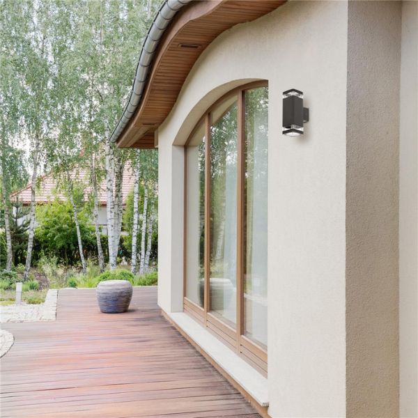 Toto venkovní svítidlo je perfektním řešením pro osvětlení vchodu do domu, pergoly, terasy, fasády apod. Jedná se o kvalitní venkovní svítidlo jehož robustní tělo je vyrobeno z práškově lakovaného hliníku, který nikdy nezrezne. Narozdíl od levných plastových venkovních nástěnných svítidel, která působením venkovních podmínek, zejména slunečního záření, postupně křehnou, mění barvu a rozpadají se, tohle se Vám s tím naším opravdu nestane. Kruhové kryty žárovek jsou vyrobeny z čirého skla, které nesnižuje svit použitých žárovek, tak jako mléčné sklo. Kryty posílají kužely světla nahoru a dolu. Světlo též proniká průhledy v horní a dolní části svítidla, vyrobenými z čirého plastu, což ze svítidla vytváří zajímavý designový světelný prvek na fasádě. Tělo svítidla není otočné, nelze nasměrovat jinak, než jak bylo namontováno.