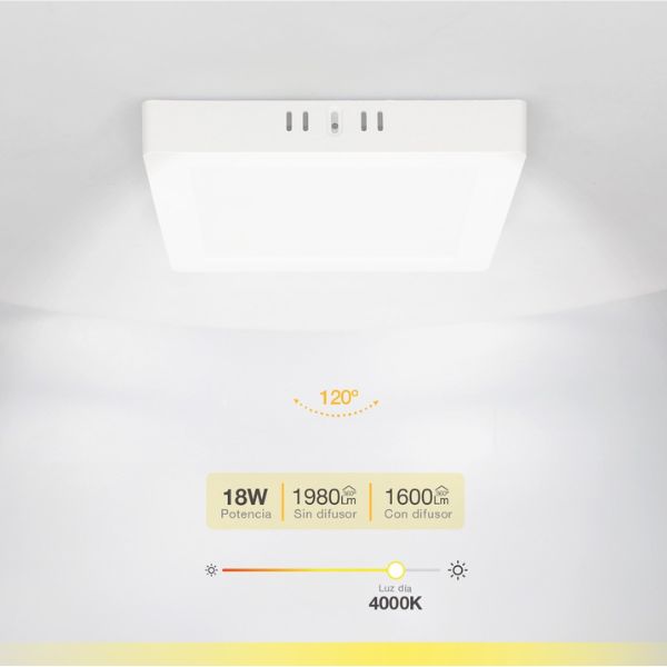 Přisazený LED panel svítí denní bílou barvou světla. Tato barva světla se blíží barvě slunečního světla přes den a pro většinu lidí je nejlepší na oči. Proto se obvykle používá v kuchyni, pracovně, kanceláři, na čtení atd.