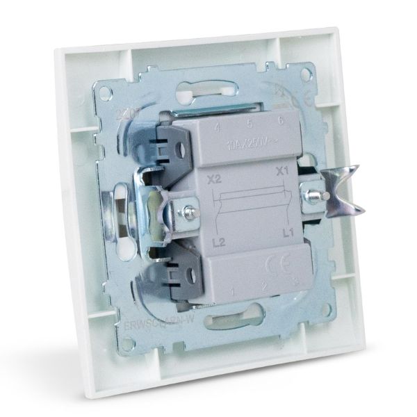 Německá značka Entac: Jednopólový křížový přepínač do zdi do instalační krabice KU68. Maximální napětí 250V. Maximální proud 10A.