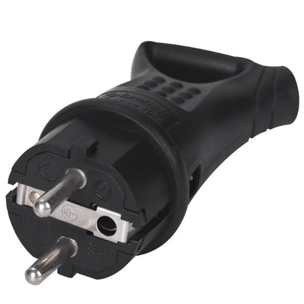 Samostatná zástrčka pro montáž ke vhodnému zařízení na 230 V nebo ke kabelu. Zástrčka je typu UNISCHUKO s uzemněním v drážkách po straně zástrčky. Ochrana IP44, voděodolné, lze používat i venku.