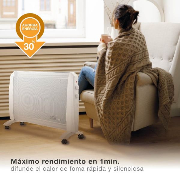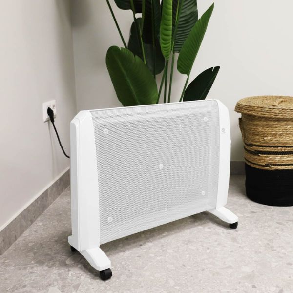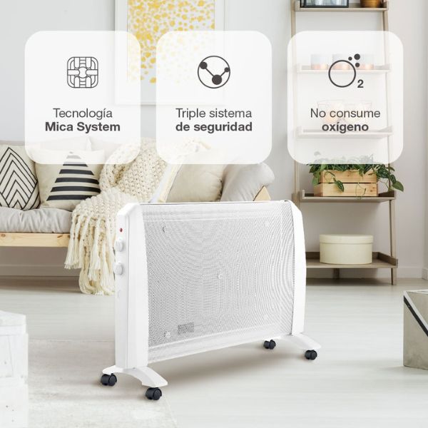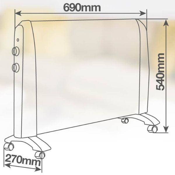 Pro bezpečné přemisťování je slídový topný panel vybaven kolečky. Samozřejmě též disponuje ochranou proti přehřátí a ochranou proti převržení. Napájecí kabel do elektrické zásuvky má délku 145cm.