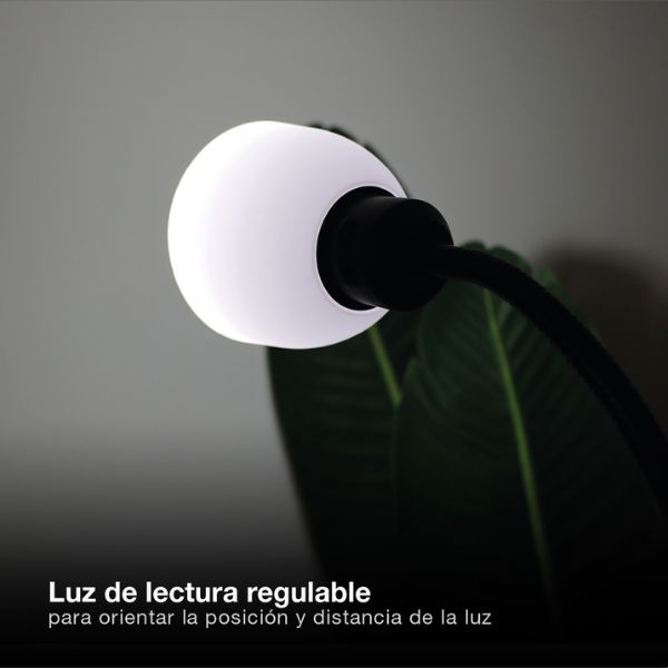 Boční klobouk je výškově nastavitelný a opatřen flexibilním krkem, takže si světlo snadno nasměrujete přesně tam, kde ho potřebujete – ideální při čtení na pohovce nebo v křesle.