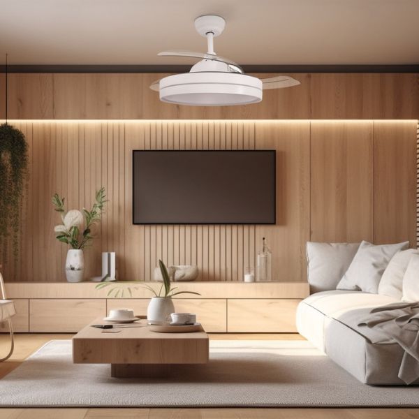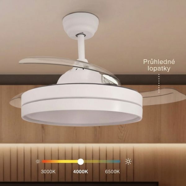 Mléčný ABS difuzor zajišťuje rovnoměrné rozptýlení světla bez oslnění. Intenzitu světla si můžete měnit podle potřeby pomocí dálkového ovládání – stropní ventilátor se světlem má funkci stmívání