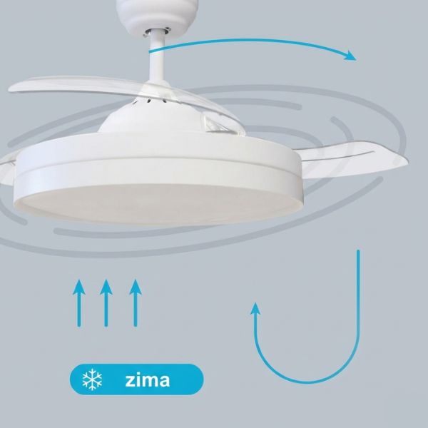 Stropní ventilátor přepnete buď na letní provoz, kdy tlačí vzduch dolů pro chlazení. Anebo zapnete zimní provoz při kterém se změní směr otáčení lopatek a ventilátor bude naopak nasávat vzduch nahoru a smíchávat ho s teplým vzduchem, který se drží u stropu, čímž se rovnoměrněji rozvede teplo po místnosti.