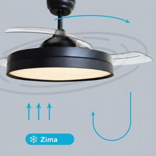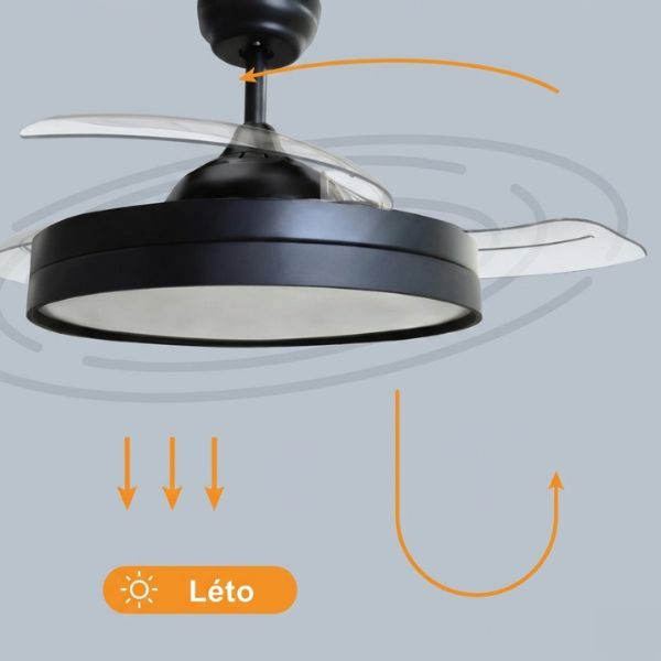 Stropní ventilátor přepnete buď na letní provoz, kdy tlačí vzduch dolů pro chlazení. Anebo zapnete zimní provoz při kterém se změní směr otáčení lopatek a ventilátor bude naopak nasávat vzduch nahoru a smíchávat ho s teplým vzduchem, který se drží u stropu, čímž se rovnoměrněji rozvede teplo po místnosti.