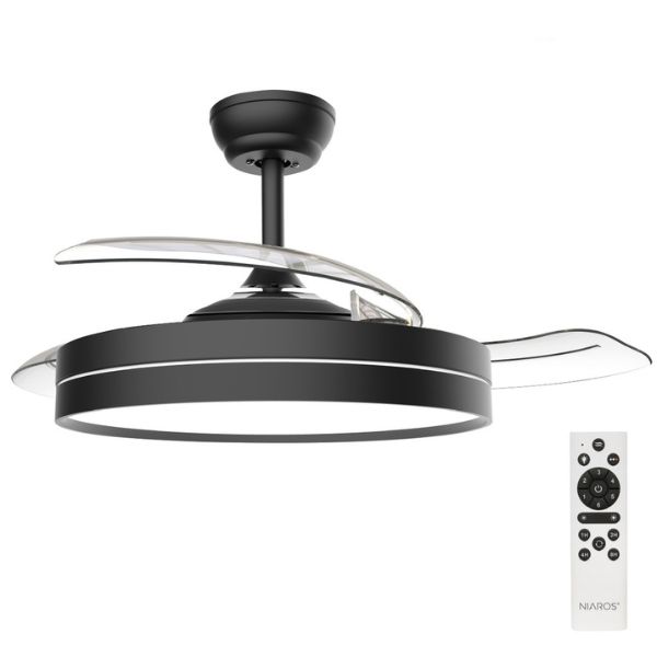 Stropní ventilátor Niaros Lugela s integrovaným LED světlem je moderní a praktické řešení pro obývací pokoj, ložnici nebo pracovnu. Spojuje účinné ochlazování vzduchu, úsporné osvětlení a elegantní design matného černého těla přístroje s průhlednými lopatkami jejichž nenápadný design neruší.