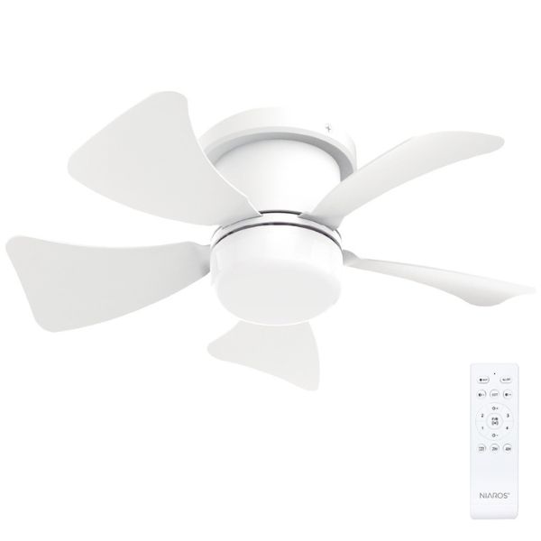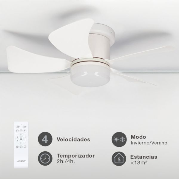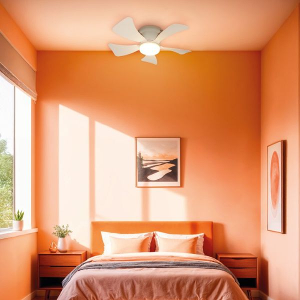 Malý stropní ventilátor Niaros Oristan s integrovaným LED světlem je moderní a praktické řešení pro obývací pokoj, ložnici nebo pracovnu. Spojuje účinné ochlazování vzduchu, úsporné osvětlení a elegantní design s 5 lopatkami v bílé barvě.