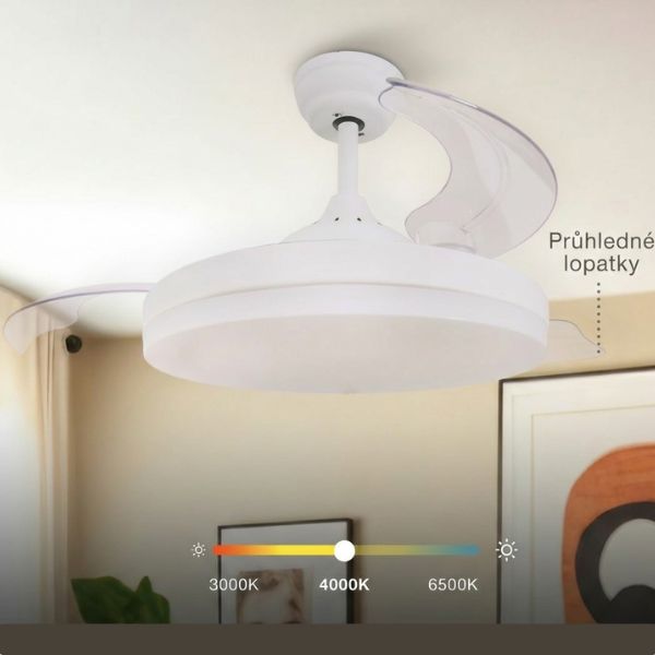 Mléčný ABS difuzor zajišťuje rovnoměrné rozptýlení světla bez oslnění. Intenzitu světla si můžete měnit podle potřeby pomocí dálkového ovládání – stropní ventilátor se světlem má funkci stmívání