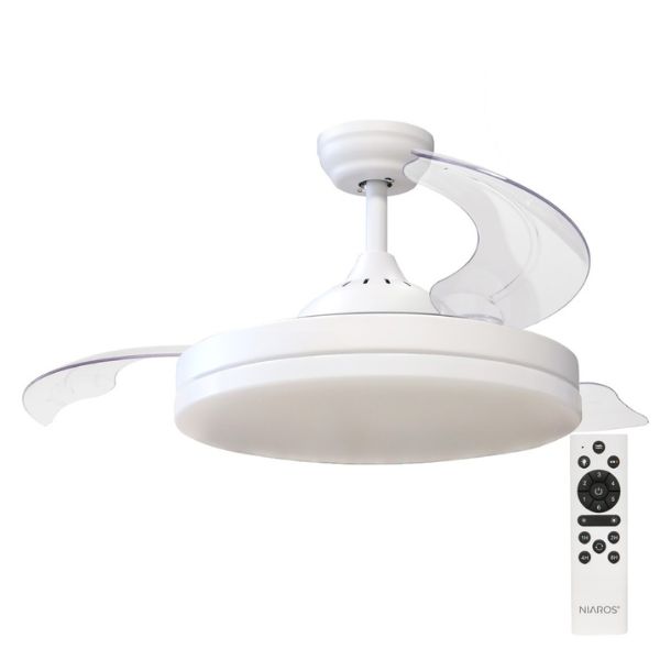 Stropní ventilátor Niaros Tungati s integrovaným LED světlem je moderní a praktické řešení pro obývací pokoj, ložnici nebo pracovnu. Spojuje účinné ochlazování vzduchu, úsporné osvětlení a elegantní design bílého těla přístroje s průhlednými lopatkami jejichž nenápadný design neruší.