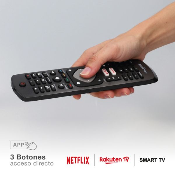Dálkový ovladač má mimo jiné 2 tlačítka pro přímý přístup do Netflixu a Rakuten TV.