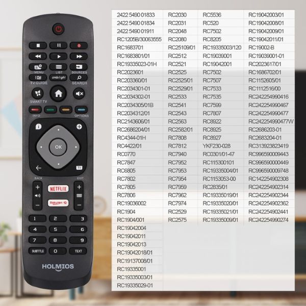 Univerzální dálkové ovládání pro Philips Smart TV španělské značky Holmios na 2 mikrotužkové baterie AAA.