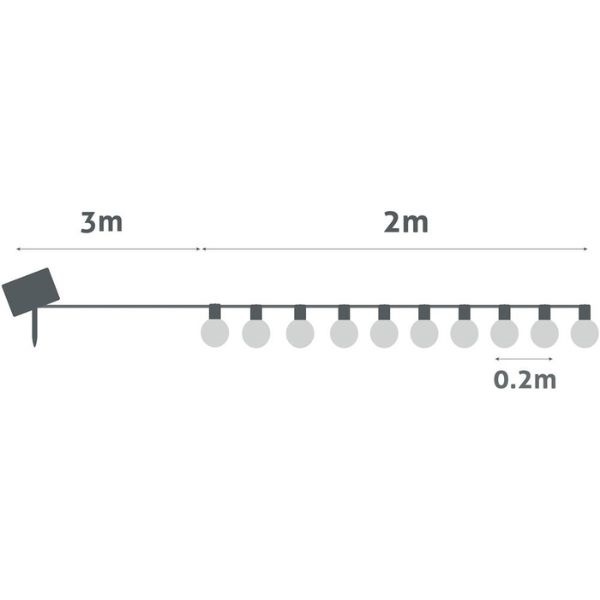 Celková délka světelného řetězu je 5m, z toho 3m měří přívodní kabel ukončený solárním napájením, a 2m je část osazená žárovkami. Rozestupy mezi jednotlivými žárovkami jsou 20cm.