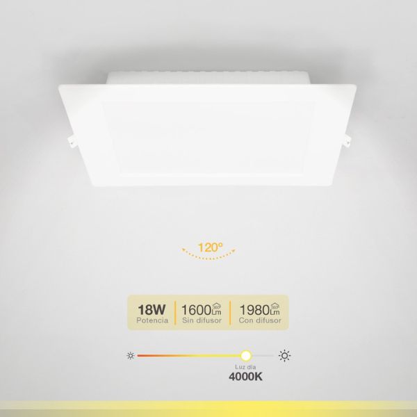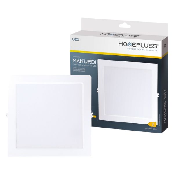 Čtvercový vestavný LED panel se spotřebou 18W, fungující na napětí 230V.