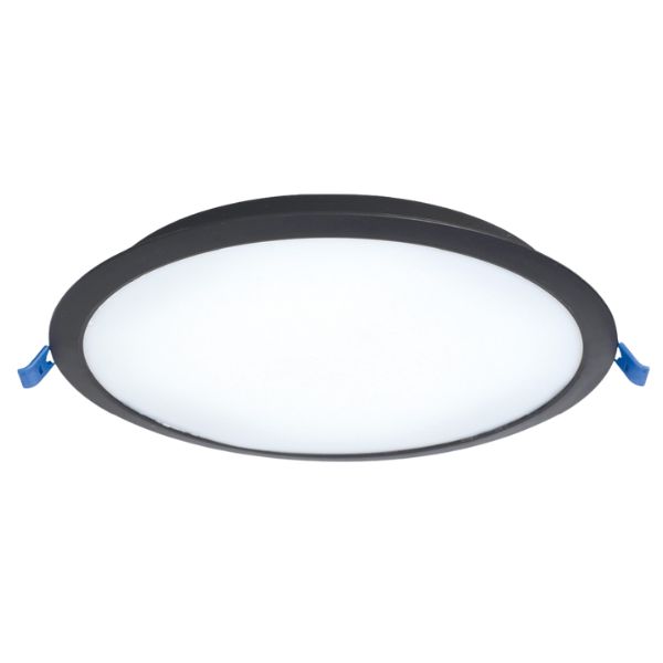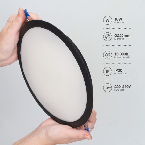 Kruhový vestavný LED panel se spotřebou 18W, fungující na napětí 230V a elegantním černým rámem.