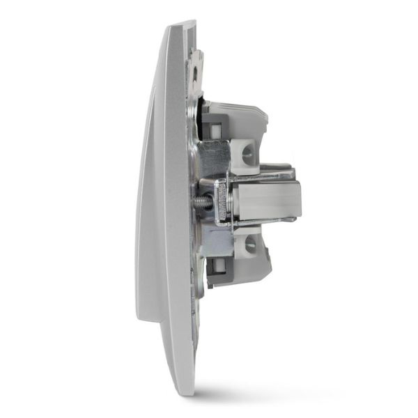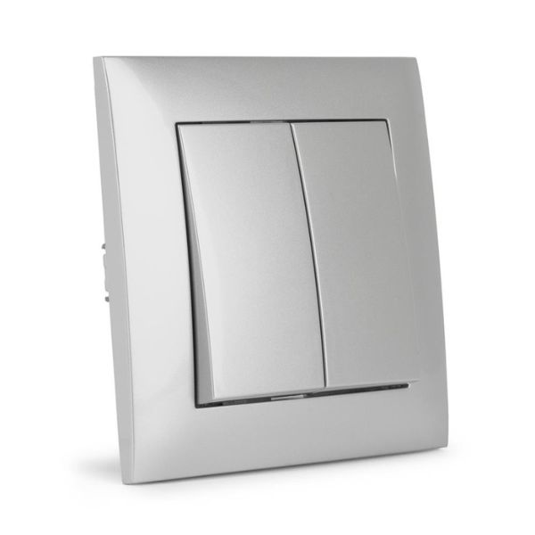 Vypínač má elegantní stříbrnou barvu, rozměry 82x82mm. Vypínač je určený do interiéru, krytí IP20. Jedná se o komplet se strojkem a rámečkem.