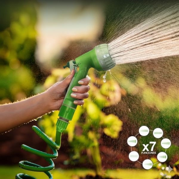 Hadice má na obou koncích rychlospojky. Do jedné zacvaknete šroubovací přípojku k vodovodnímu kohoutku (viz fotogalerie) a do druhé stříkací pistoli se 7 funkcemi postřiku – od jemné mlhy pro květiny až po silný proud pro čištění povrchů a aut, které si snadno nastavíte pootočením hlavy pistole. To vše je součástí balení.